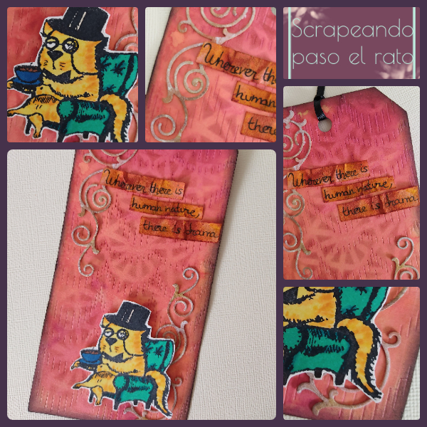 Como veis, éste es uno de esos proyectos donde he cambiado por completo el fondo. Gracias a mis tintas, un troquel y una plantilla, ha pasado de ser amarillo a tener esos tonos naranjas y rojizos. Para acabar con él, añadí esas formas troqueladas y oscurecí los bordes del tag.